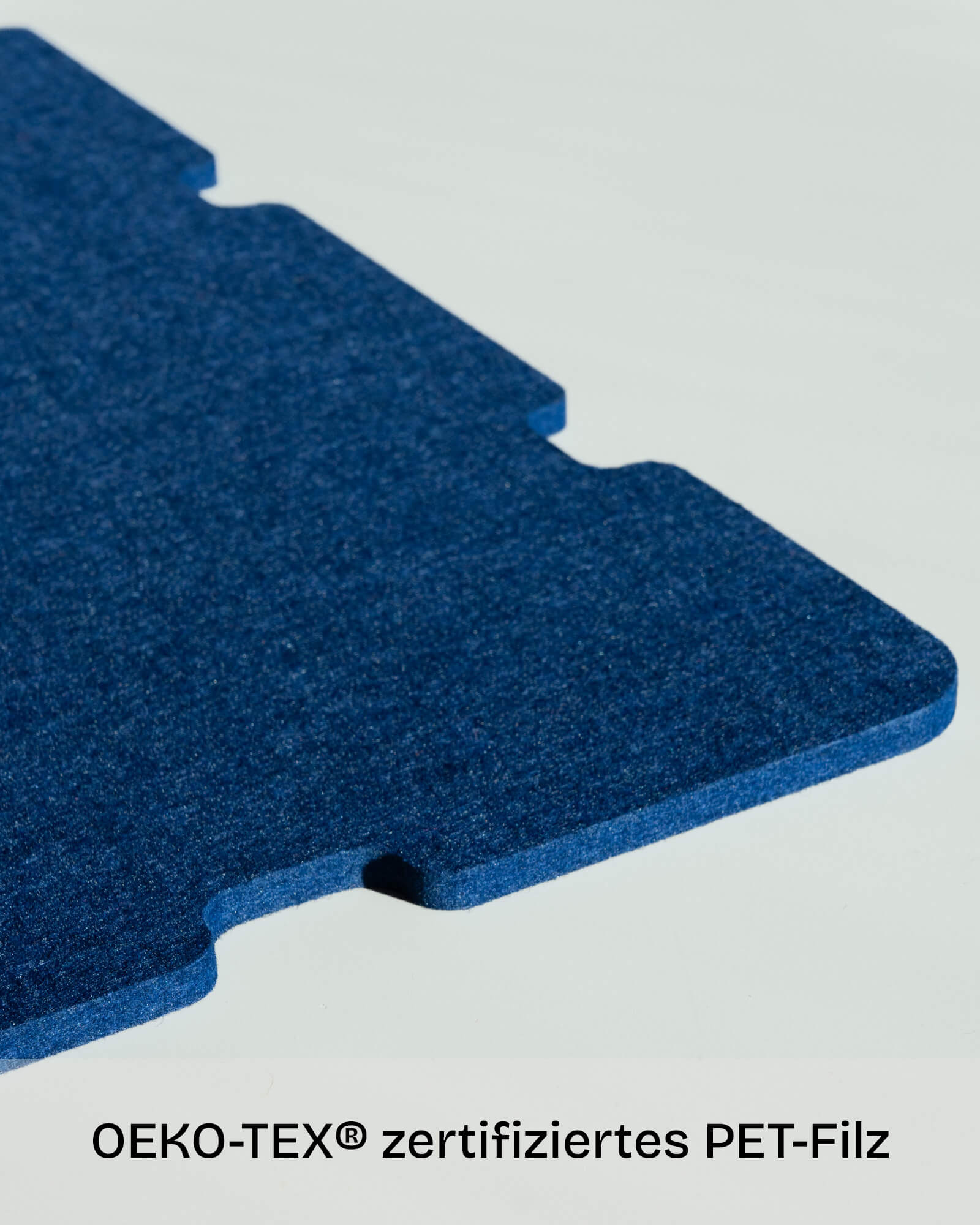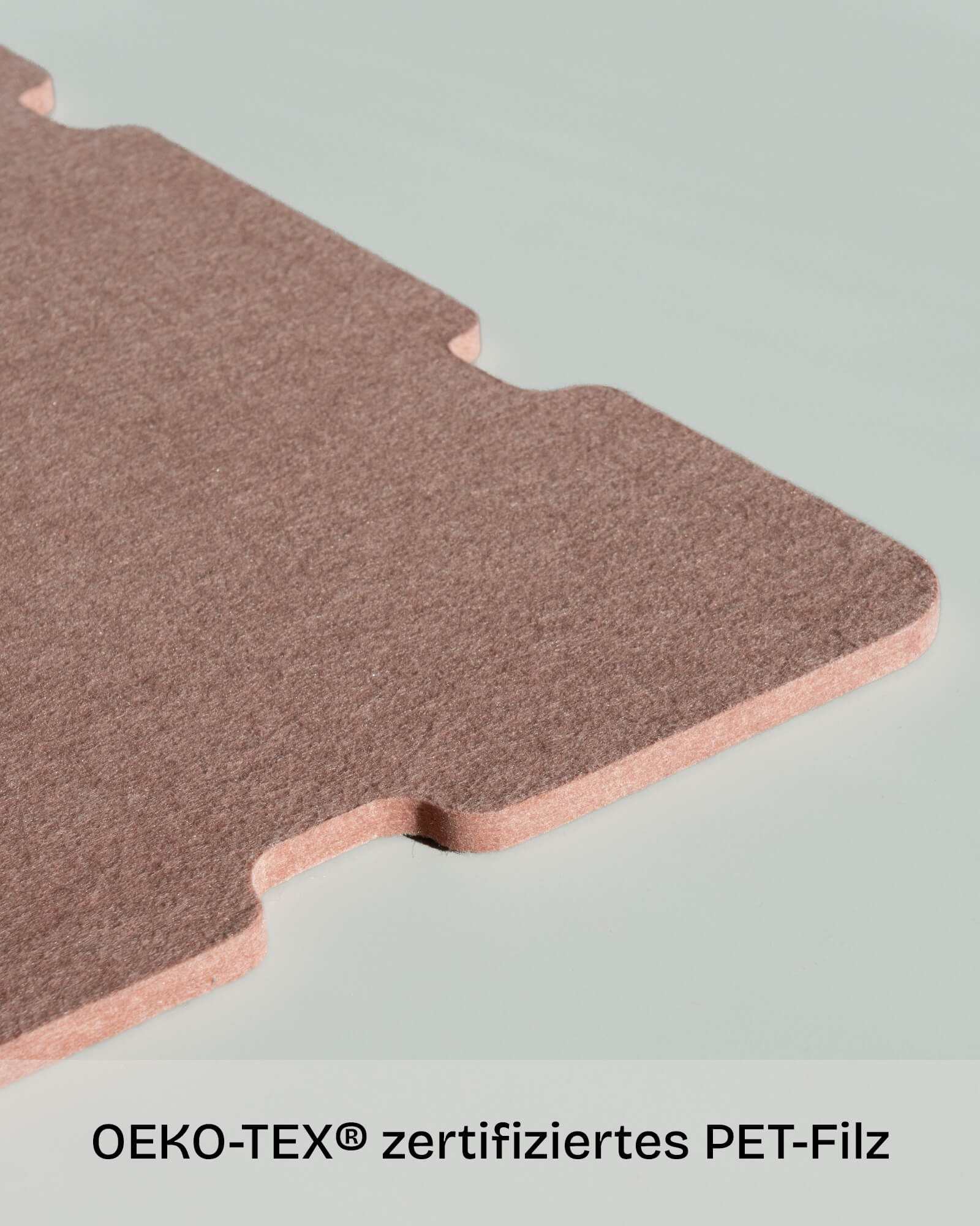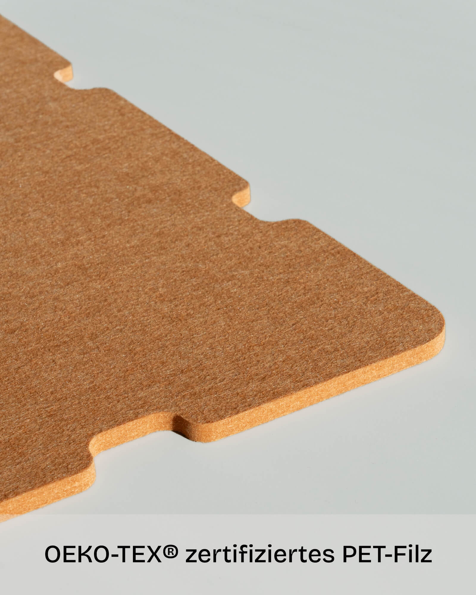 Viele verbinden Filz mit weichen Dekoartikeln. Wir nutzen jedoch deutlich robusteren, formstabilen PET-Filz. Das Material ist langlebig und im Alltag erstaunlich unempfindlich. Staub lässt sich einfach absaugen, kleine Flecken mit einem feuchten Tuch entfernen.