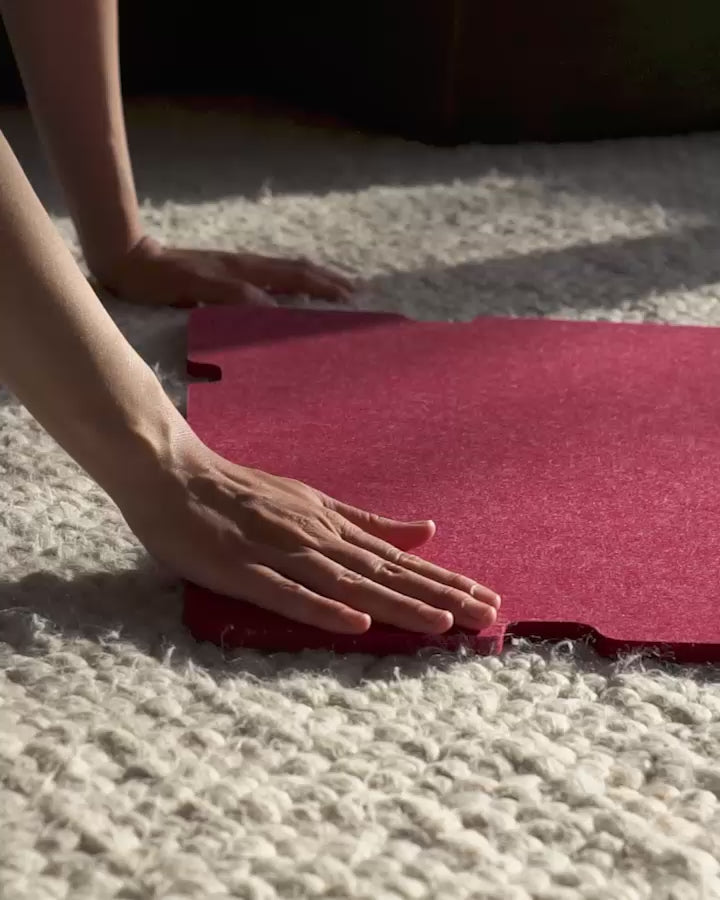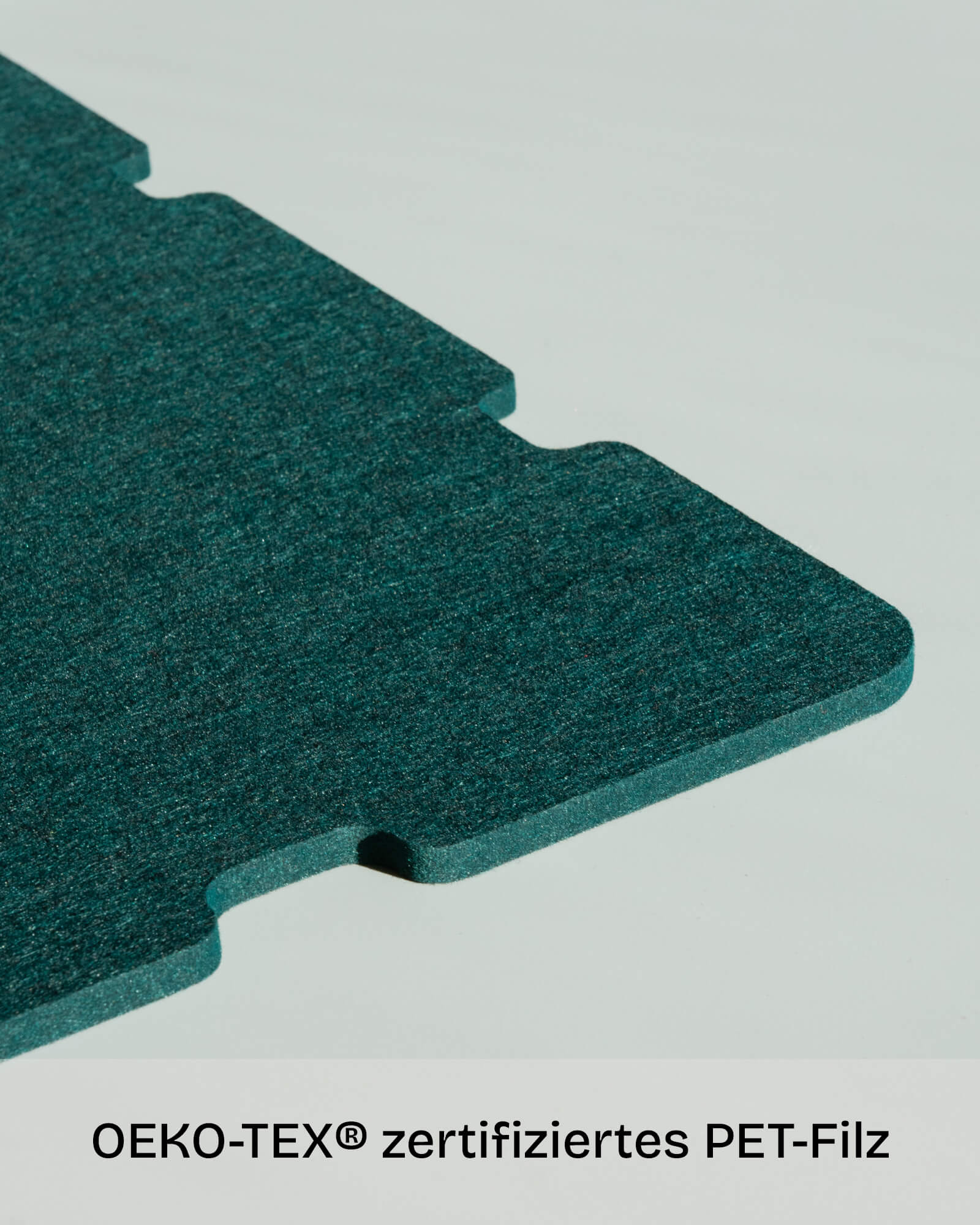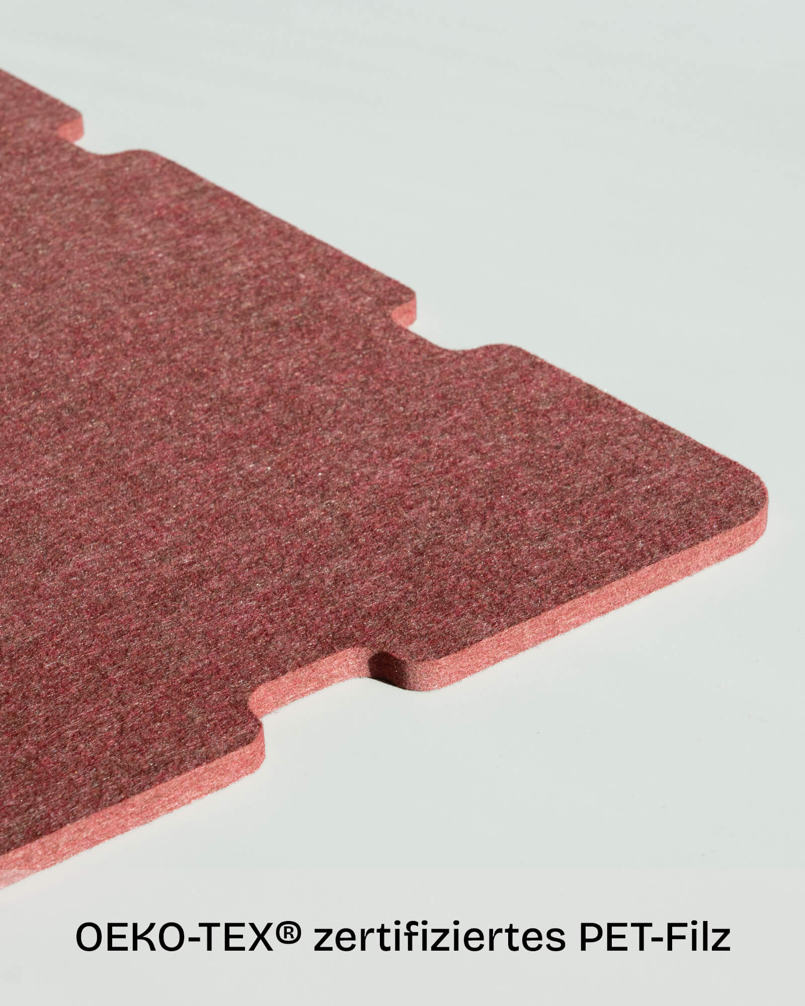 Viele verbinden Filz mit weichen Dekoartikeln. Wir nutzen jedoch deutlich robusteren, formstabilen PET-Filz. Das Material ist langlebig und im Alltag erstaunlich unempfindlich. Staub lässt sich einfach absaugen, kleine Flecken mit einem feuchten Tuch entfernen.
