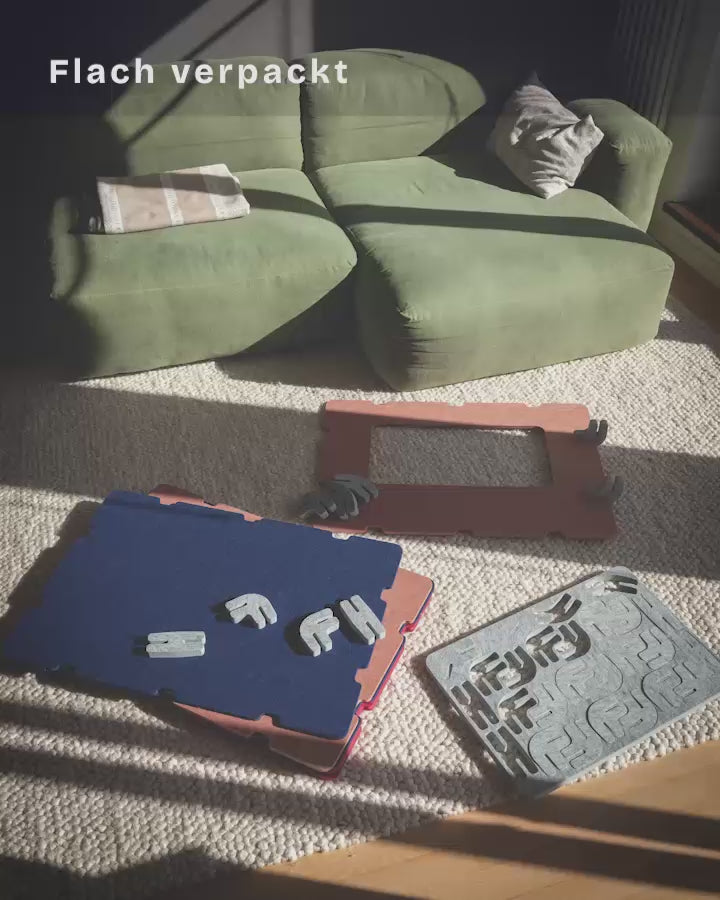 Unser PET-Filz besteht zu mindestens 75 % aus Post-Consumer-Rezyklat. Aus rund 150 Plastikflaschen pro Haus wird ein langlebiges Design-Möbel. Als Monomaterial-System verzichtet Wuule konsequent auf Werkstoff-Mixe und ist dadurch voll kreislauffähig.