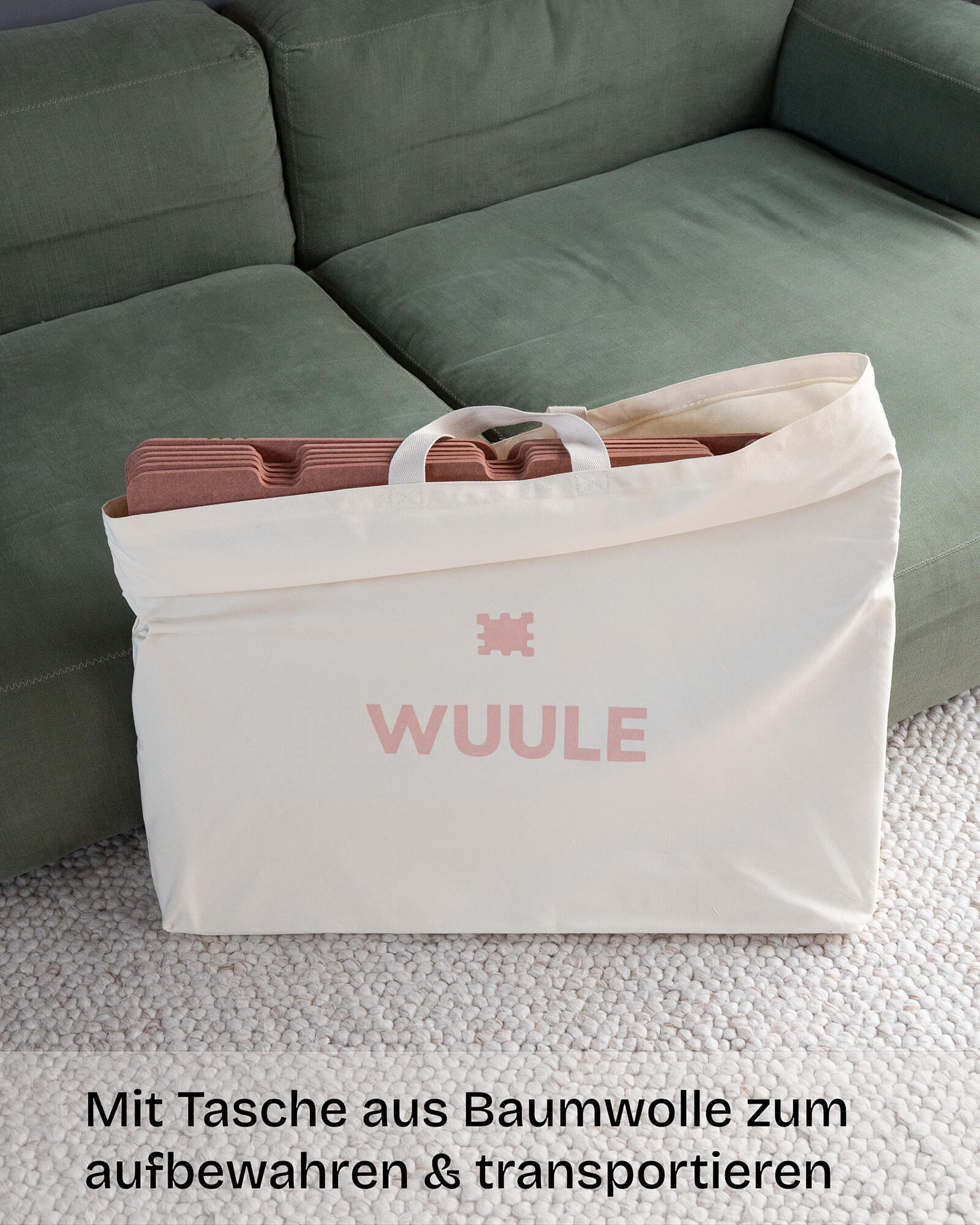 Wuule braucht beim Spielen etwas Platz, passt aber gut in typische Wohn- und Kinderzimmer. Das Spielhaus ist leicht, so dass du es schnell zur Seite stellen kannst. Wenn du den Platz anderweitig brauchst, kannst du alle Teile flach stapeln und in der Tasche verstauen.